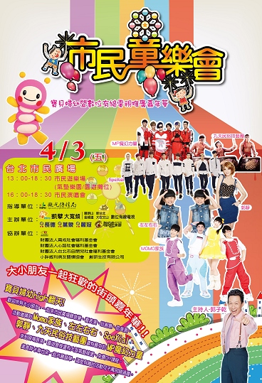 另外,喜歡追星的年輕朋友,也千萬別錯過下午四點開始的市民演唱會,強大卡司,包括了深受六七八九年級喜愛的MP魔幻力量、郭靜、SPEXIAL接力開唱,小寶貝們的偶像左左右右、MOMO家族的哥哥姊姊,更會帶來精彩的唱唱跳跳,氣勢磅礡的九天民俗技藝團,更為整場的活動,揭開完美序幕!
